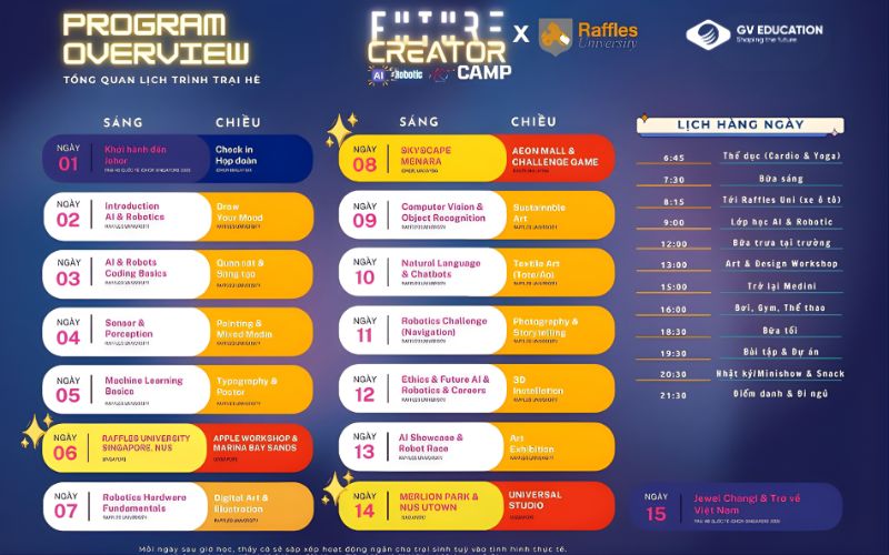 2 tuần tại trại hè Raffles Camp không chỉ là một chuyến đi, đó là một khoản đầu tư cho tư duy và tương lai. Khi con bước ra khỏi vùng an toàn, tiếp cận với những công nghệ hàng đầu thế giới tại Raffles University, con sẽ nhận ra giới hạn của mình xa hơn những gì con từng nghĩ.